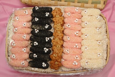 韓菓のセット。中央の花模様がヤックァ(蜜入りの揚げ菓子/약과)、それ以外の白、ピンク、黒の菓子がユグァ