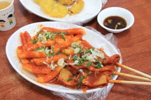堤川名物のパルガンオデン(辛口おでん/빨간오뎅)を中心にトッポッキ(餅炒め/떡볶이)や、ティギム(天ぷら/튀김)などの軽食を揃える。