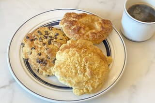ソボロパン(手前)とチョコソボロパン(左)。ソウル市龍山区漢江路1街「ソボロパンチプ(소보로빵집)」にて2024年6月5日撮影。